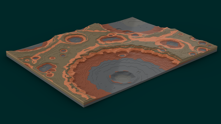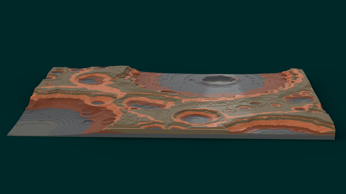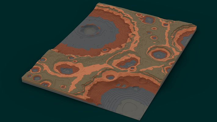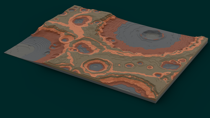 Diverse Leute aus unserer Community sind auch bereits dabei und machen mit. Nach einigen Sitzungen haben wir auch schon einige Rahmenbedingungen festgelegt. Klar ist das Grundlayout. Marc hat eine Kraterlandschaft geplant 3x4 m2. Farblich haben wir uns da ebenfalls schon geeinigt: dark grey, dark bluish grey, dark orange, medium nougat und dark tan (von unten nach oben). Hier seht ihr das Modell: